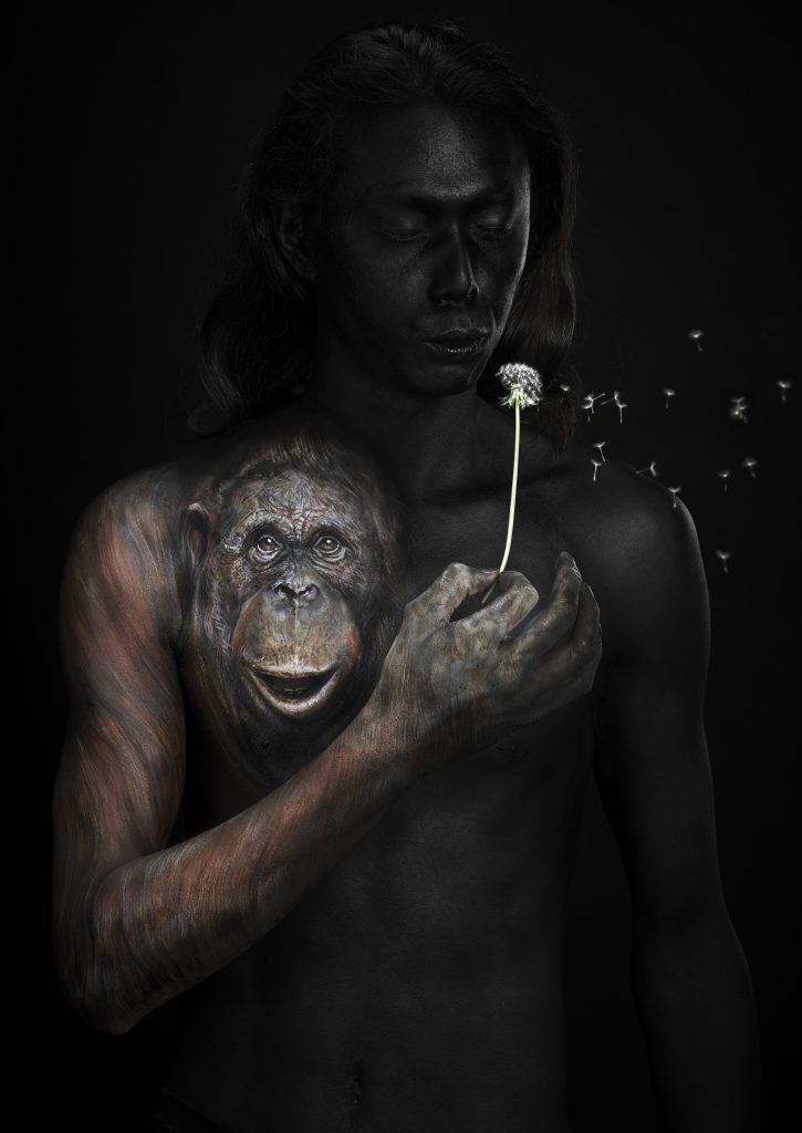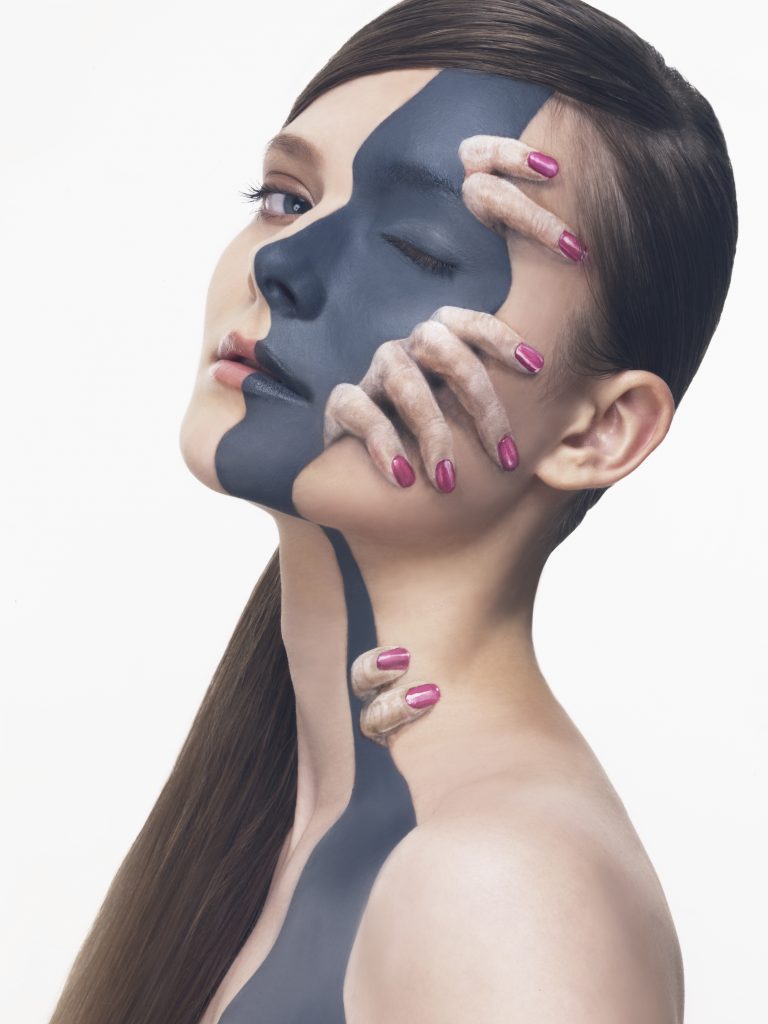 À l’ère du numérique et du 3D, il choisit encore de peindre à main levée. Directement sur des visages et des corps humains, des surfaces vivantes et non planes, avec un simple pinceau.